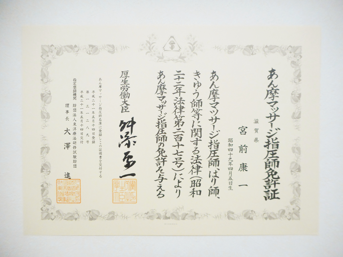 | 所属協会 | (社)全日本鍼灸マッサージ師会 正会員 (社)滋賀県鍼灸マッサージ師会 正会員 大津鍼灸マッサージ師会 正会員 |