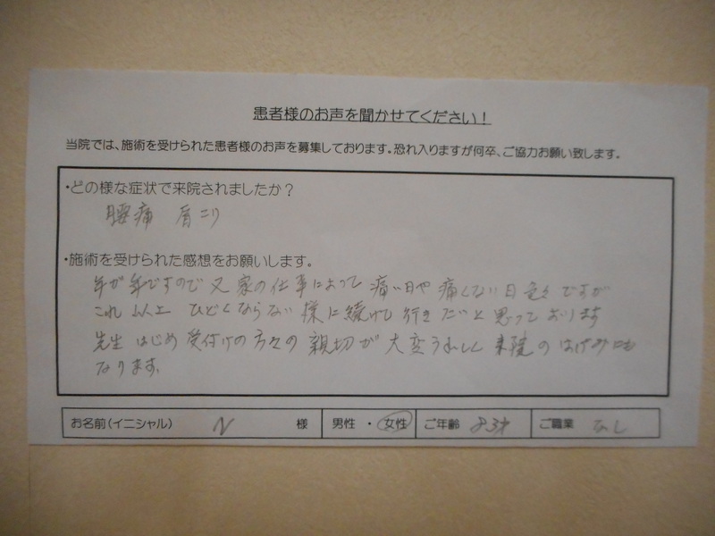 - 坐骨神経痛が苦痛にならなくなりました 大津市石山 I様 女性 69才